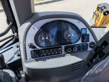 Трансмиссия Carraro с гидромеханической коробкой передач (4 передачи вперед и 4 назад) и возможностью переключения под нагрузкой повышает комфорт и скорость работы. [1] Доступен полный привод 4WD с подключаемым передним мостом и 100% блокировкой заднего дифференциала, что улучшает проходимость на слабых грунтах и в зимних условиях. Максимальная скорость до 32 км/ч позволяет быстро перемещать машину между объектами, сокращая незарабатывающее время.